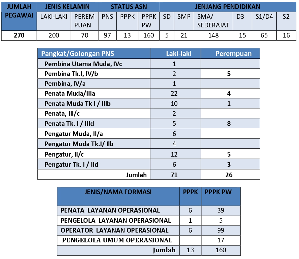 Dalam rangka melaksanakan tugas dan fungsi yang dibebankan kepada Dinas Koperasi, Usaha Kecil dan Menengah, Perindustrian dan Perdagangan, dibutuhkan SDM yang tangguh, profesional, berwawasan luas, dan andal serta berkomitmen pada tugas sehingga dapat memberikan kontribusi yang maksimal untuk pencapaian target kinerja yang telah ditetapkan. Berdasarkan data kepegawaian pada Dinas Koperasi, Usaha Kecil dan Menengah, Perindustrian dan Perdagangan per-31 Desember 2025, sumber daya manusia di Dinas Koperasi, Usaha Kecil dan Menengah, Perindustrian dan Perdagangan berjumlah 270 (dua ratus tujuh puluh) personil.