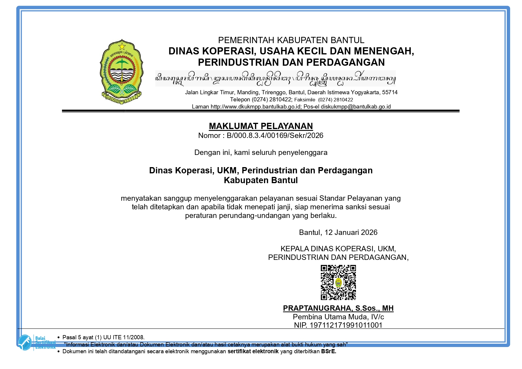 Berikut tautan untuk mengunduh Dokumen Maklumat Pelayanan Dinas Koperasi Usaha Kecil dan Menengah Perindustrian dan Perdagangan Kabupaten Bantul 2026